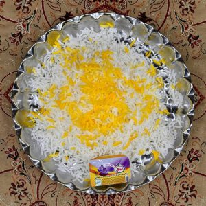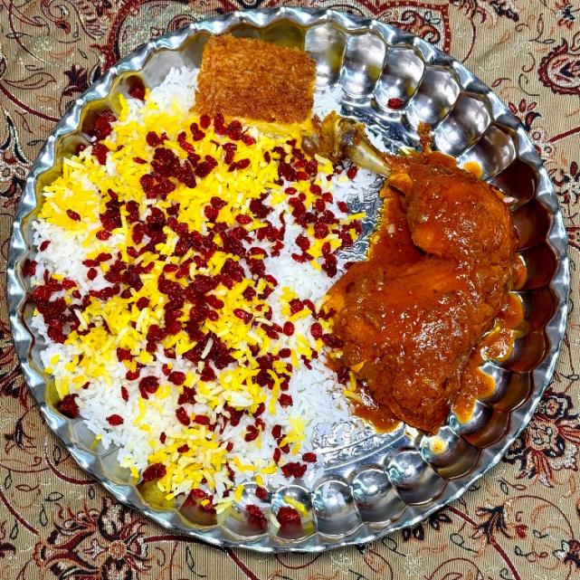 ۵۰۰ گرم ران مرغ سرخ شده، ۳۵۰ گرم زرشک پلو با برنج ایرانی