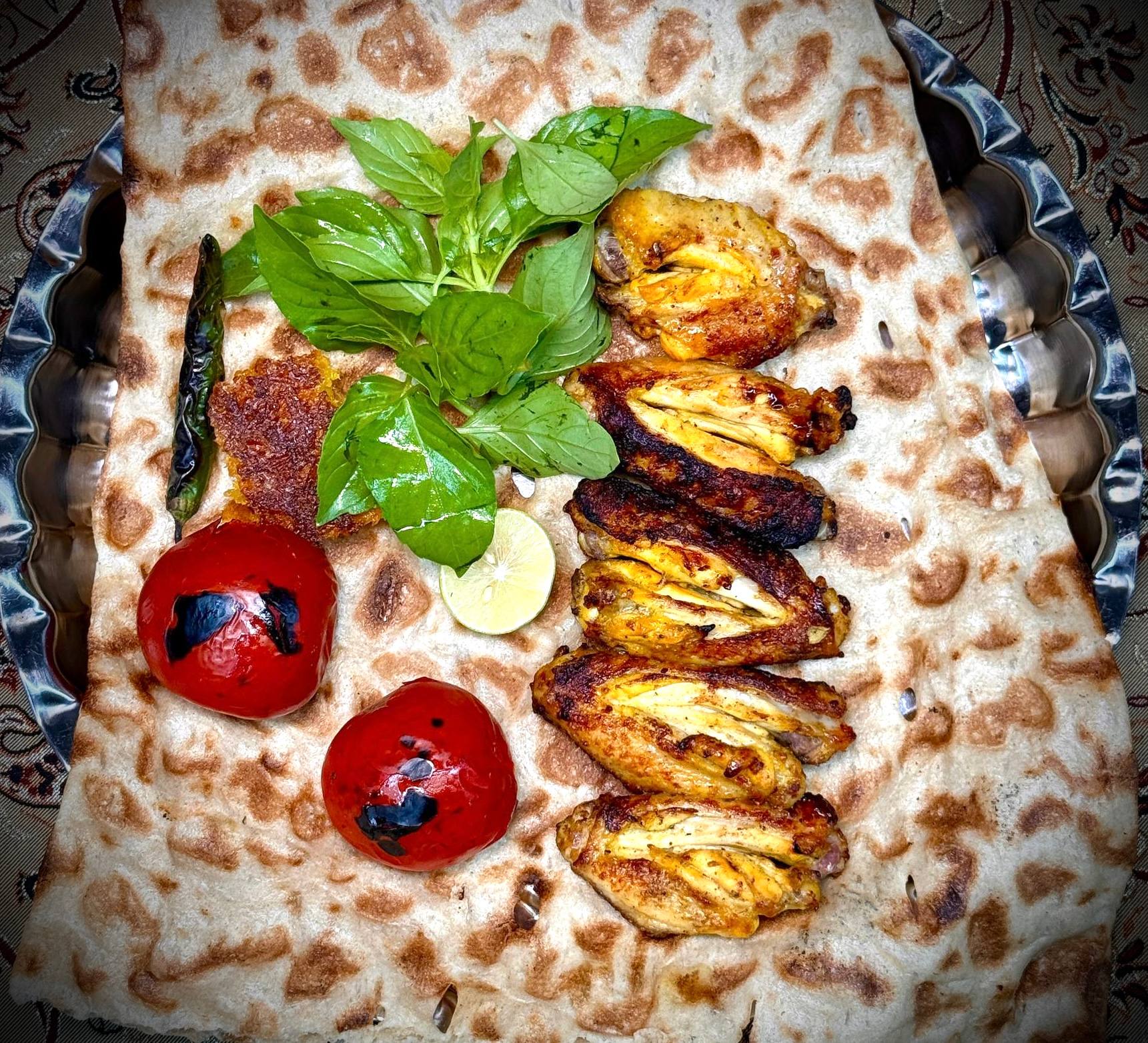 یک سیخ بال ذغالی ۵ عدد بال، ۲ عدد گوجه، نصف نان سنگک