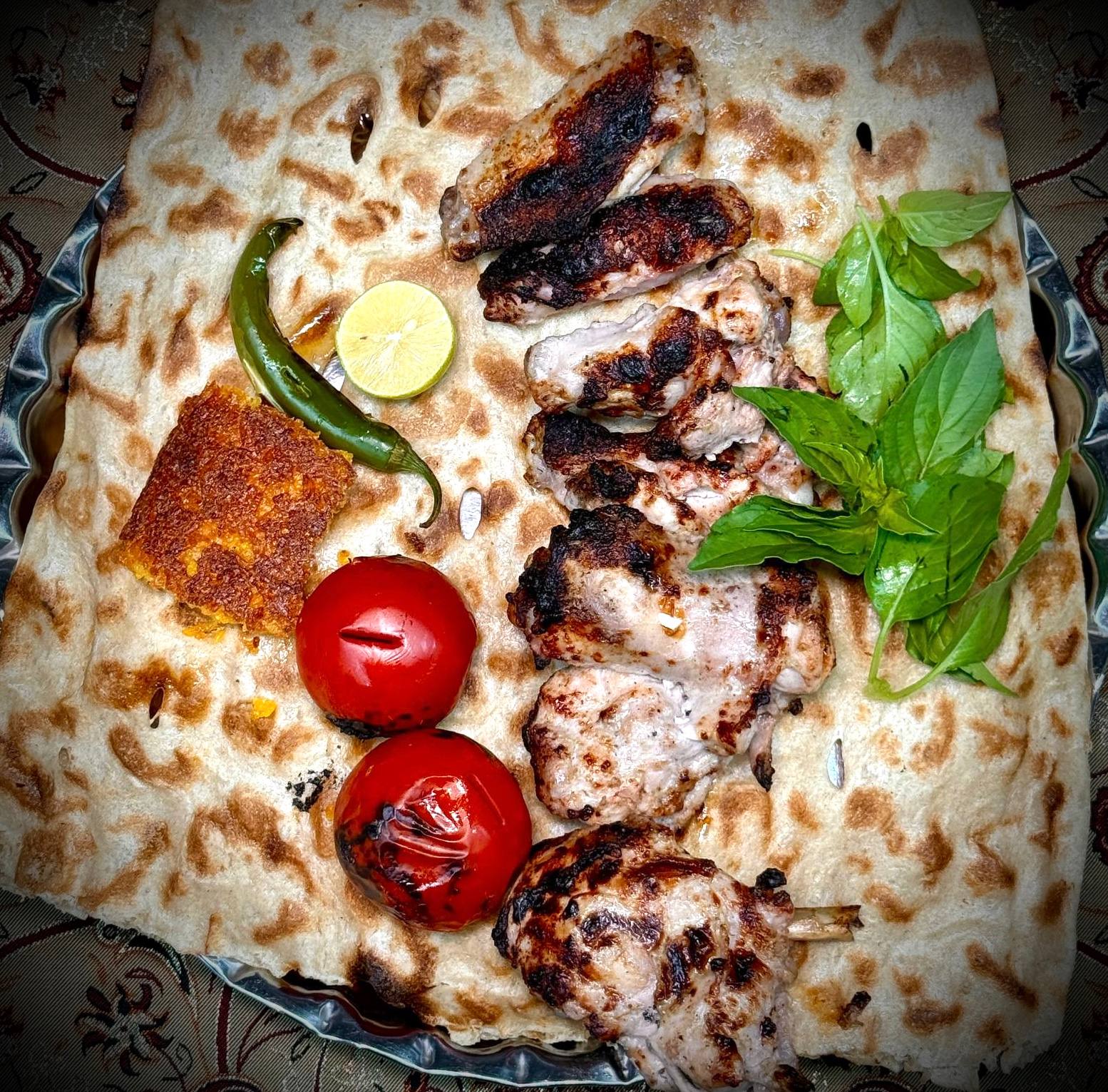 جوجه کباب سینه مرغ زعفرانی 180 گرمی، دورچین: گوجه کبابی، فلفل کبابی، سبزی، به همراه یک تکه نان سنگک