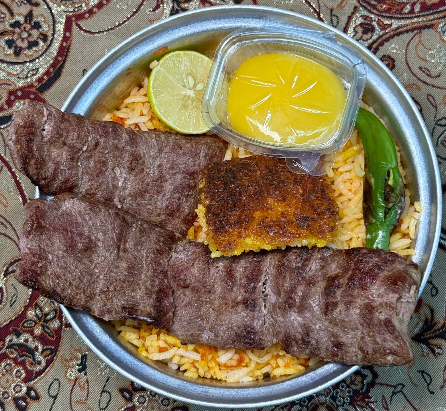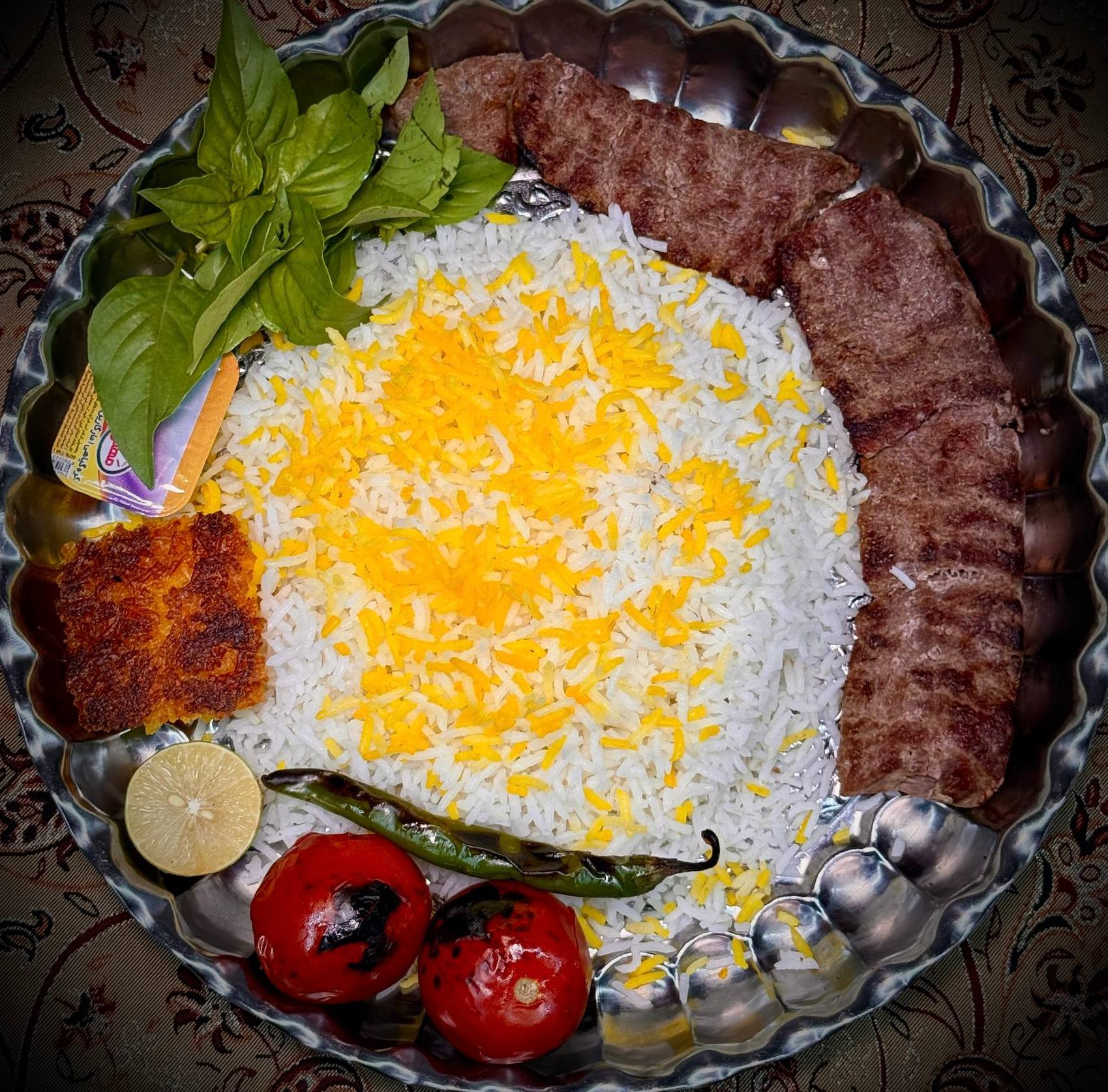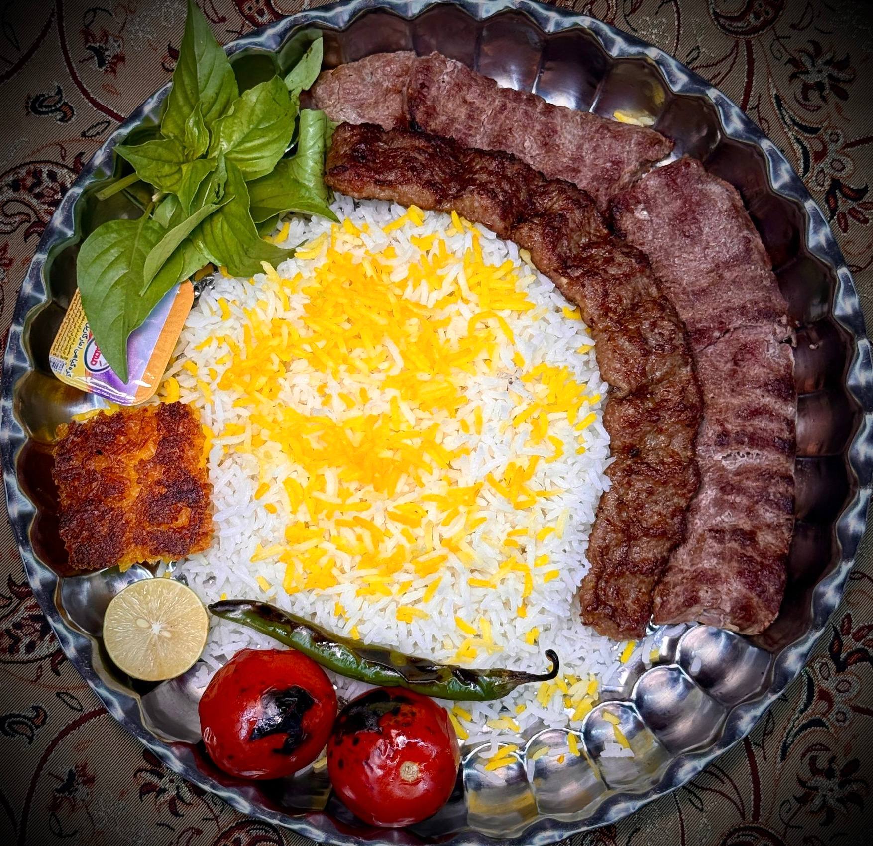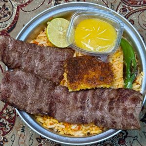 ۲ سیخ کباب کوبیده مخلوط گوشت گوساله و گوسفندی ۱۰۰ گرمی، ۳۵۰ گرم برنج ایرانی، گوجه کبابی، کره