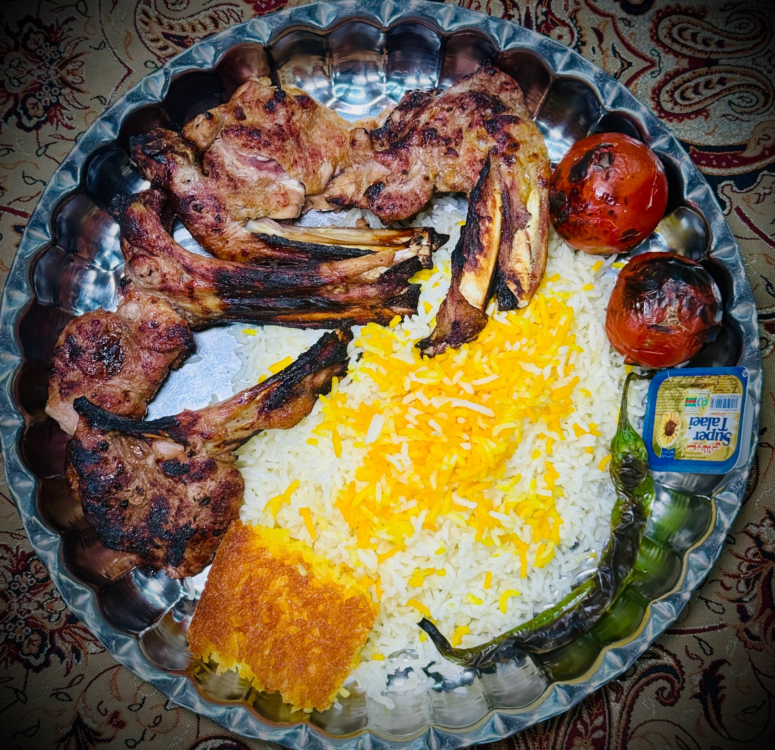 یک سیخ، کباب دنده گوسفندی 400 گرمی، دورچین: گوجه کبابی، فلفل کبابی، سبزی، به همراه یک تکه نان سنگک